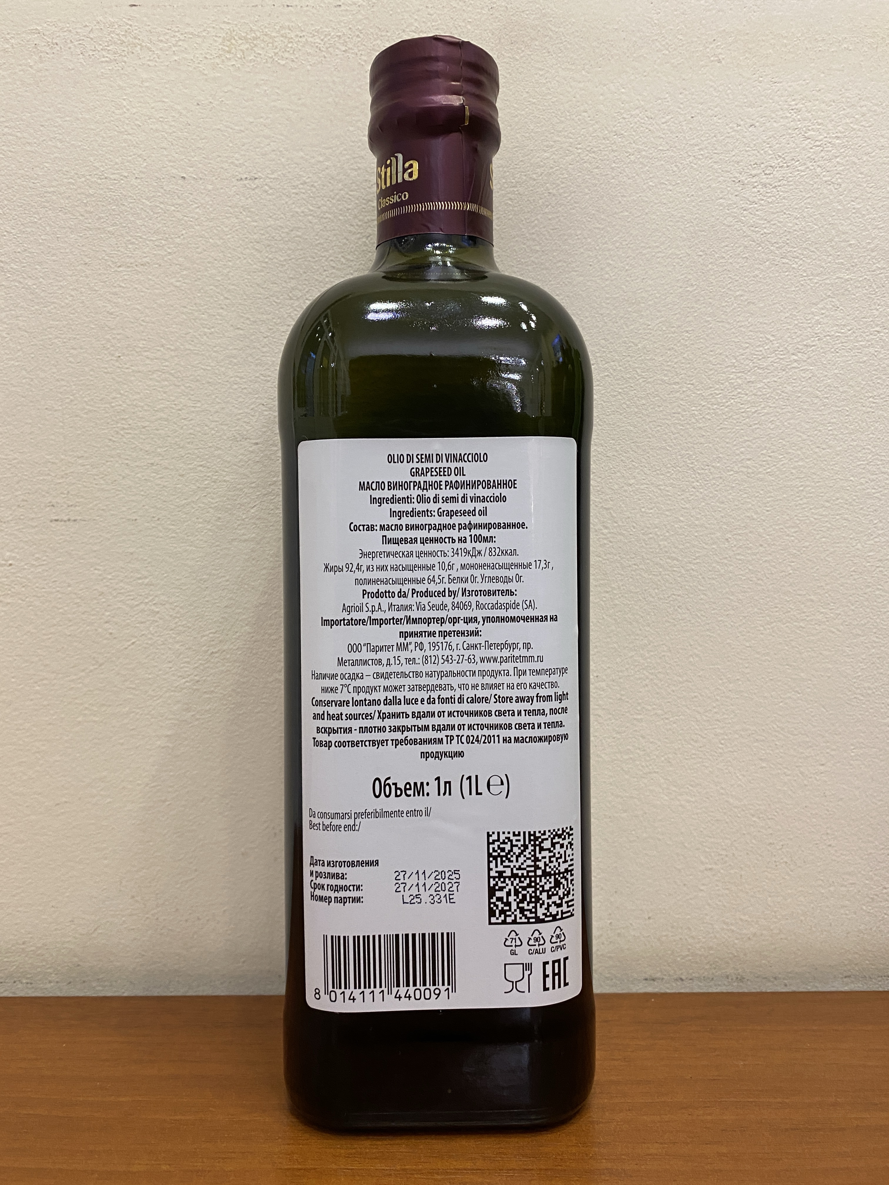 Виноградное масло STILLA очищенное (РАФ) 1 л ст, ИТАЛИЯ