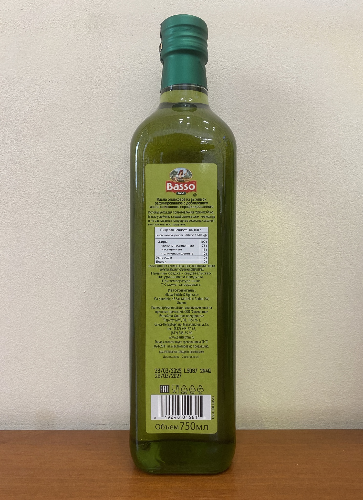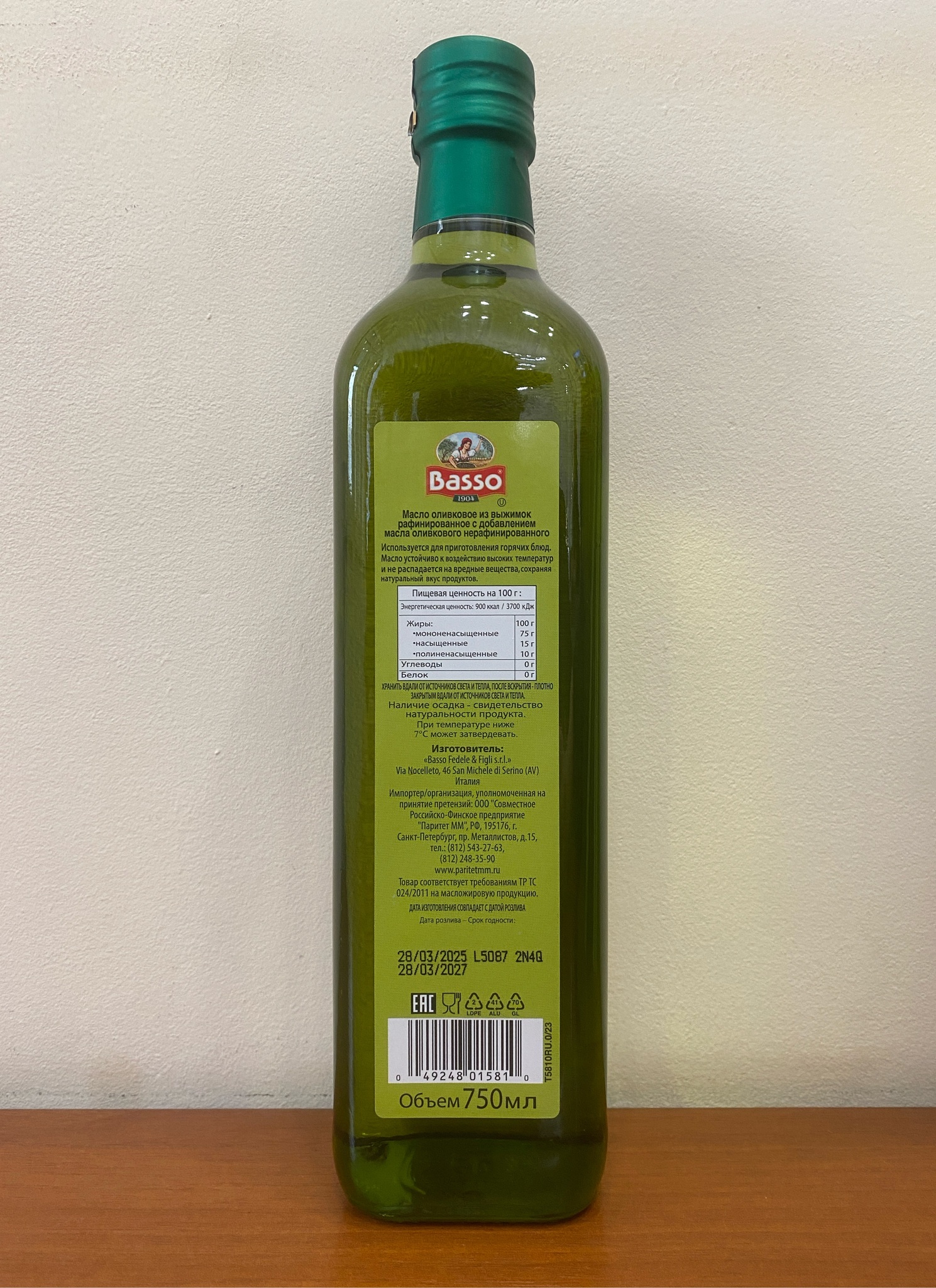 Оливковое масло BASSO РАФИНИРОВАННОЕ (Pomace) в стекл. бутылке 0,75 л