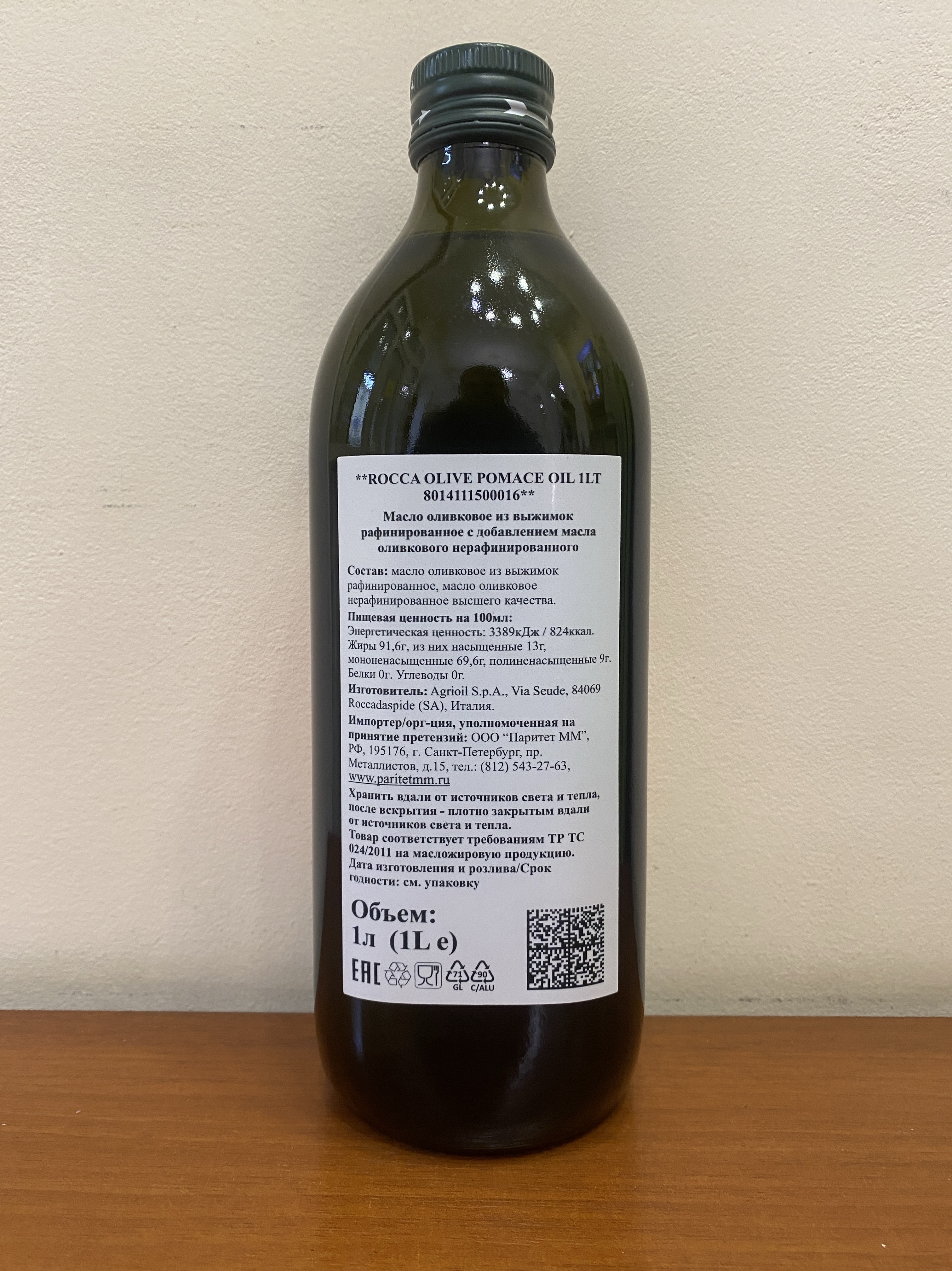 Оливковое масло ROCCA Olio di Sansa (Pomace) 1 литр в стеклянной бутылке.
