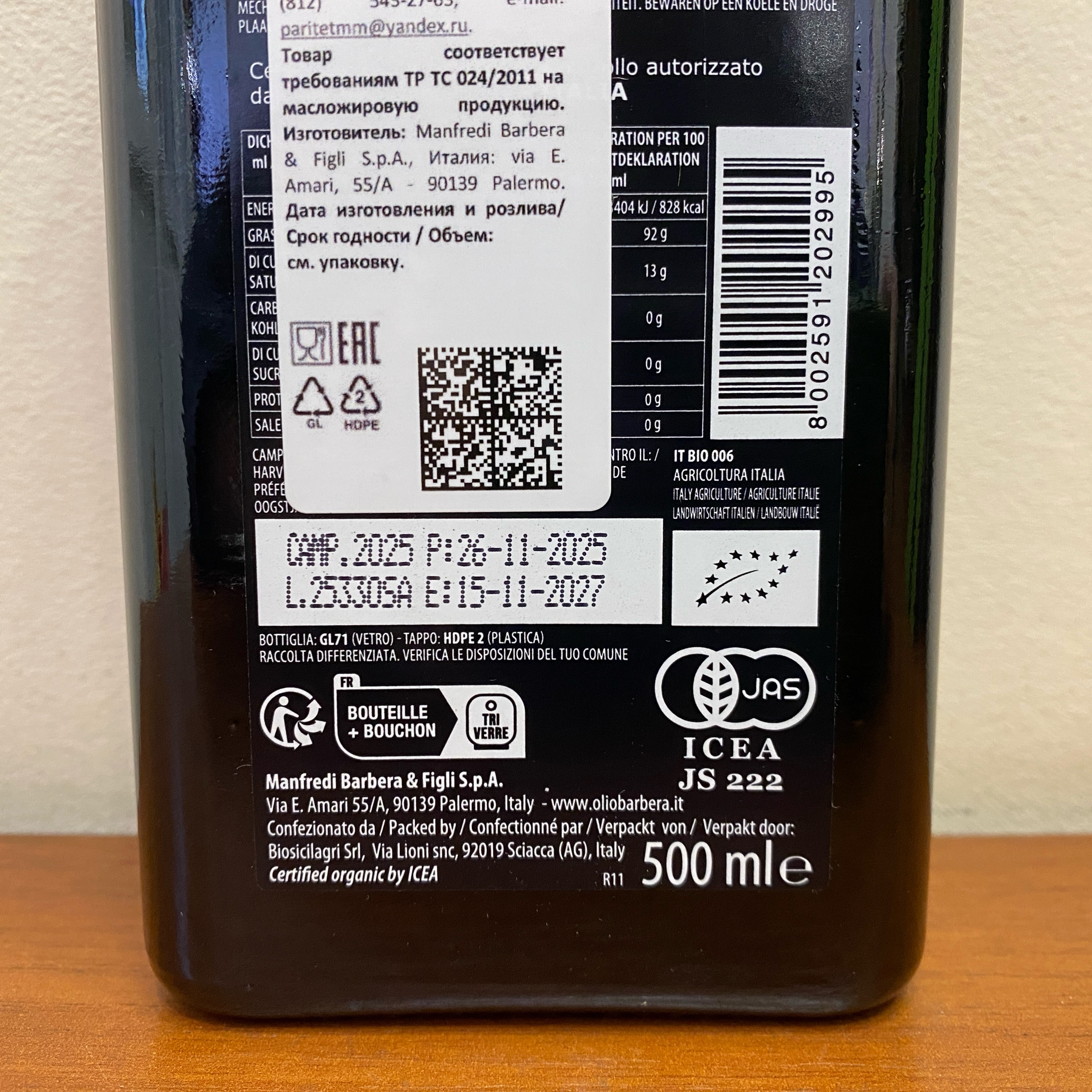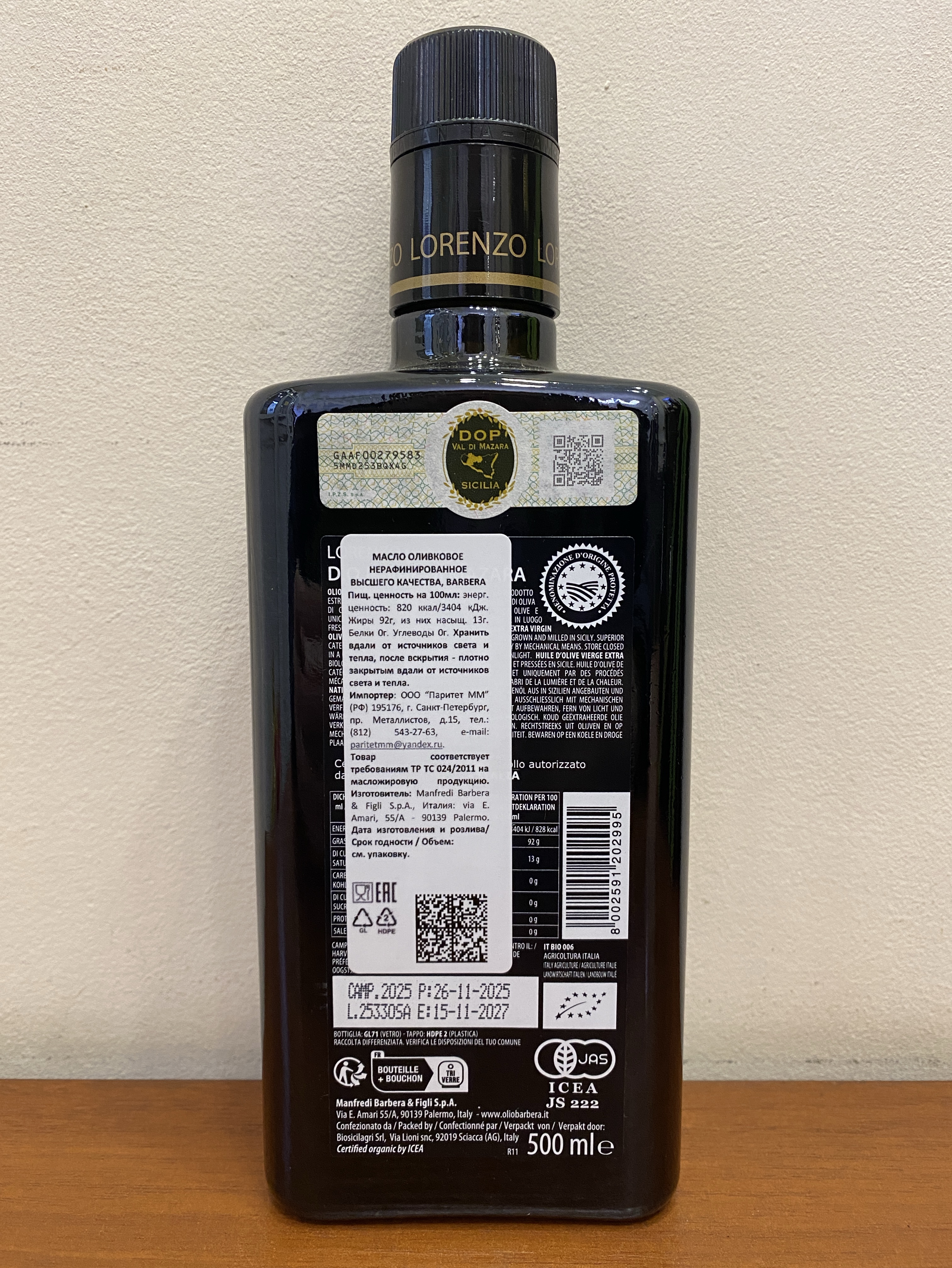 Оливковое масло нерафинированное Premium Class, BARBERA LORENZO №3 ORGANIC (Bio), D.O.P. Val di Mazara Extra Virgin в стеклянной бутылке 500 мл