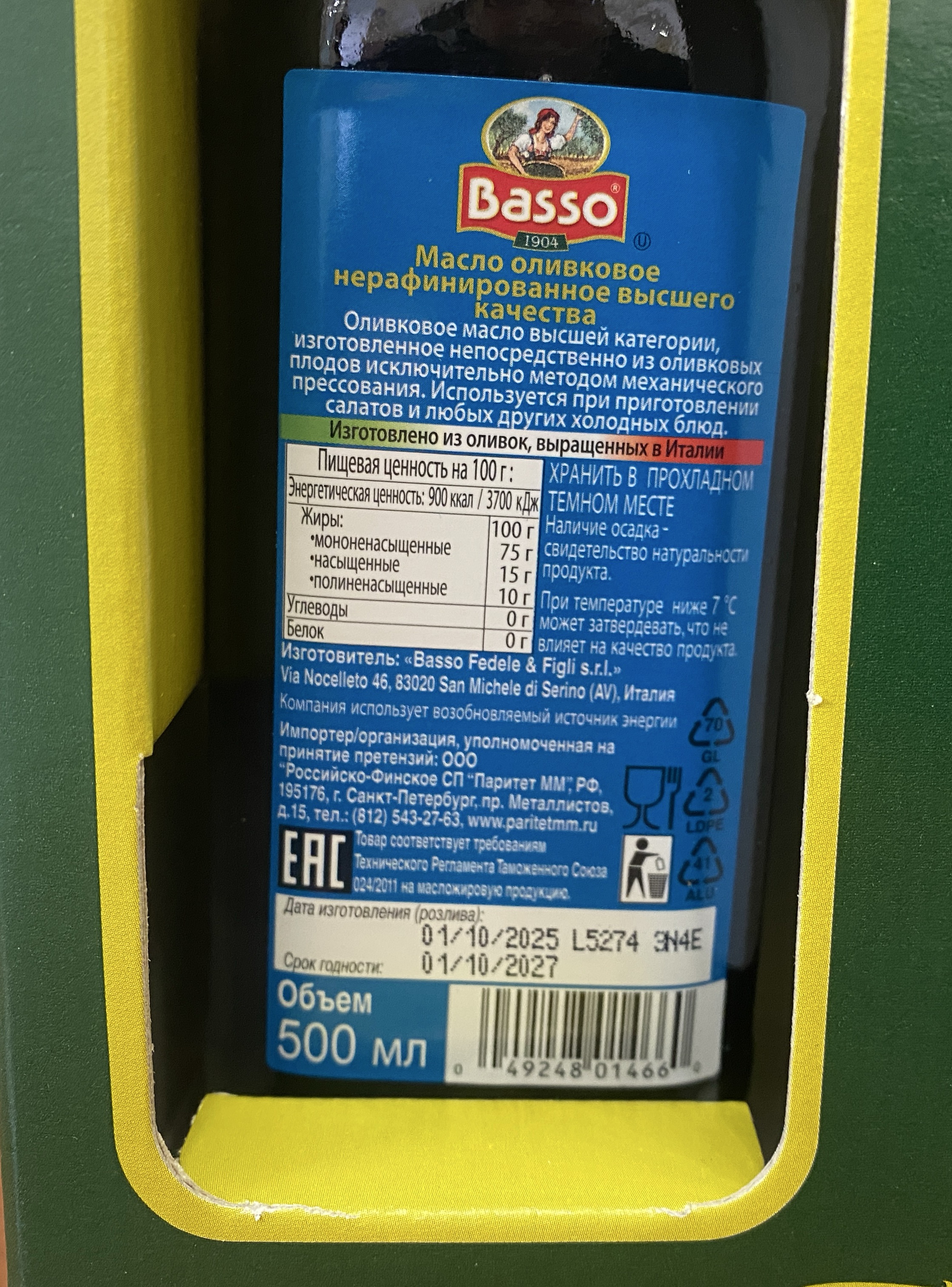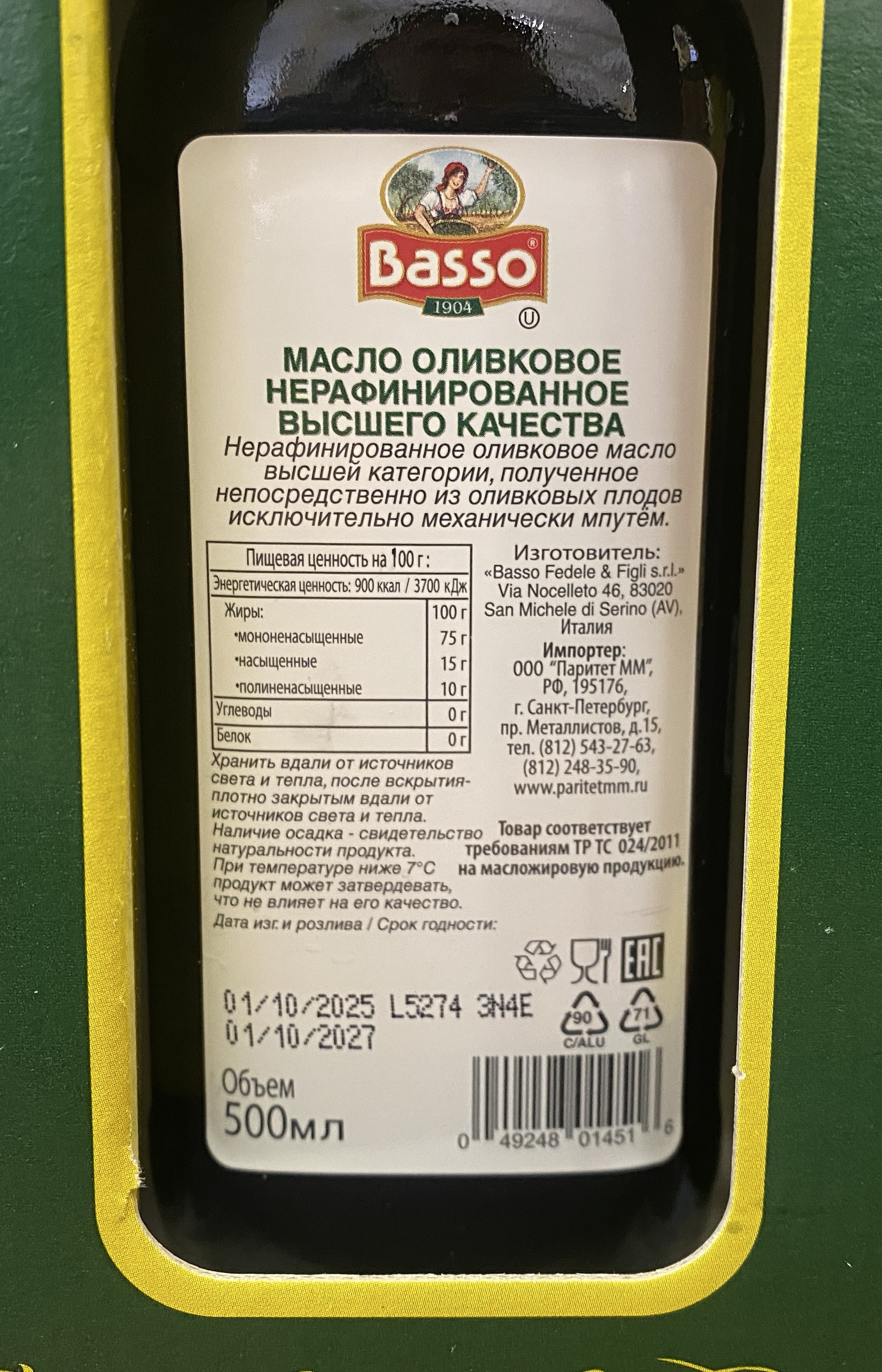 Нерафинированное оливковое масло высшего качества, изготовленное непосредственно из оливковых плодов, выращенных в Италии, исключительно механическим путём.