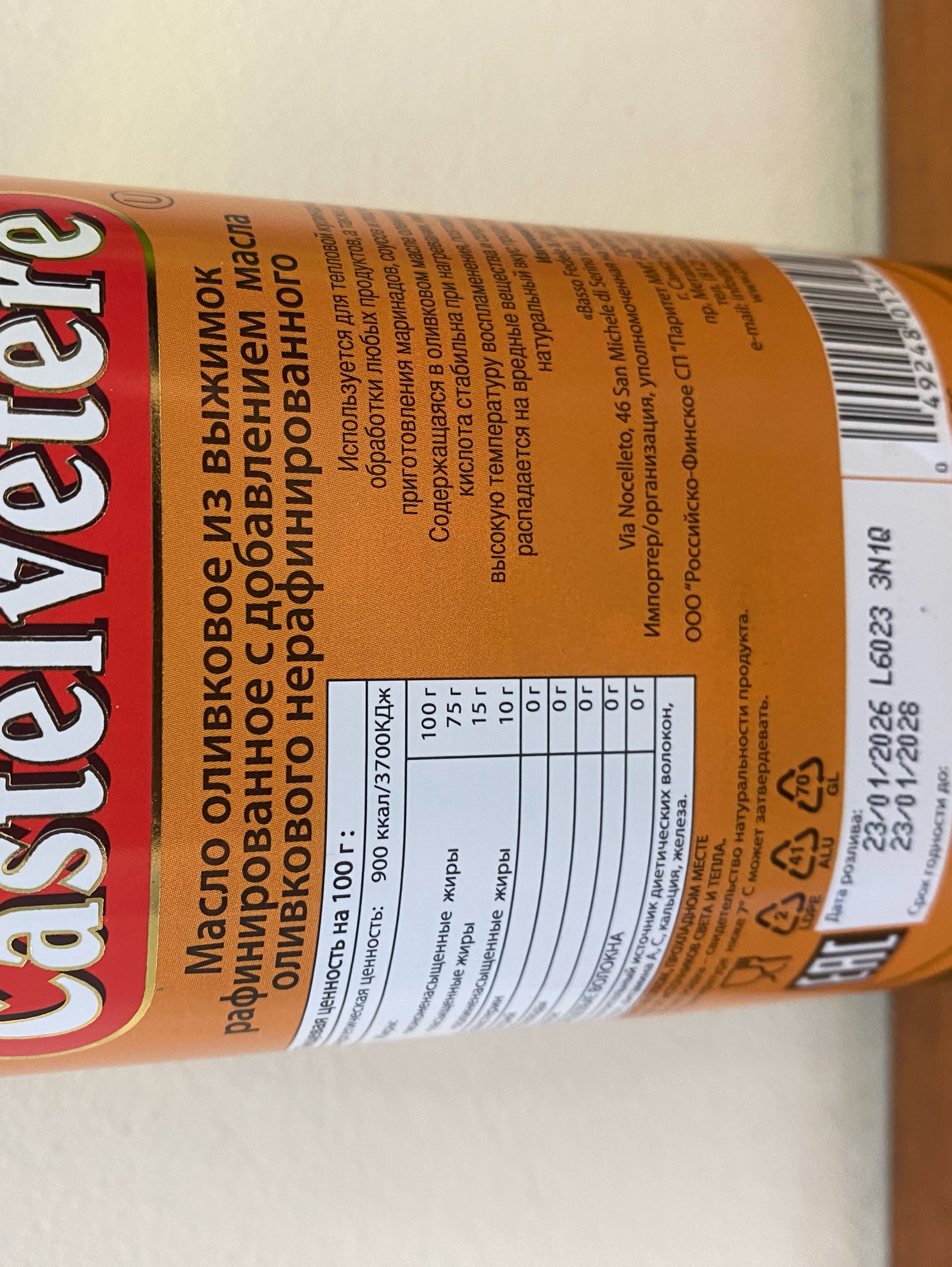 Оливковое масло Castelvetere РАФИНИРОВАННОЕ (Pomace) в стекл. бут. 1 литр.