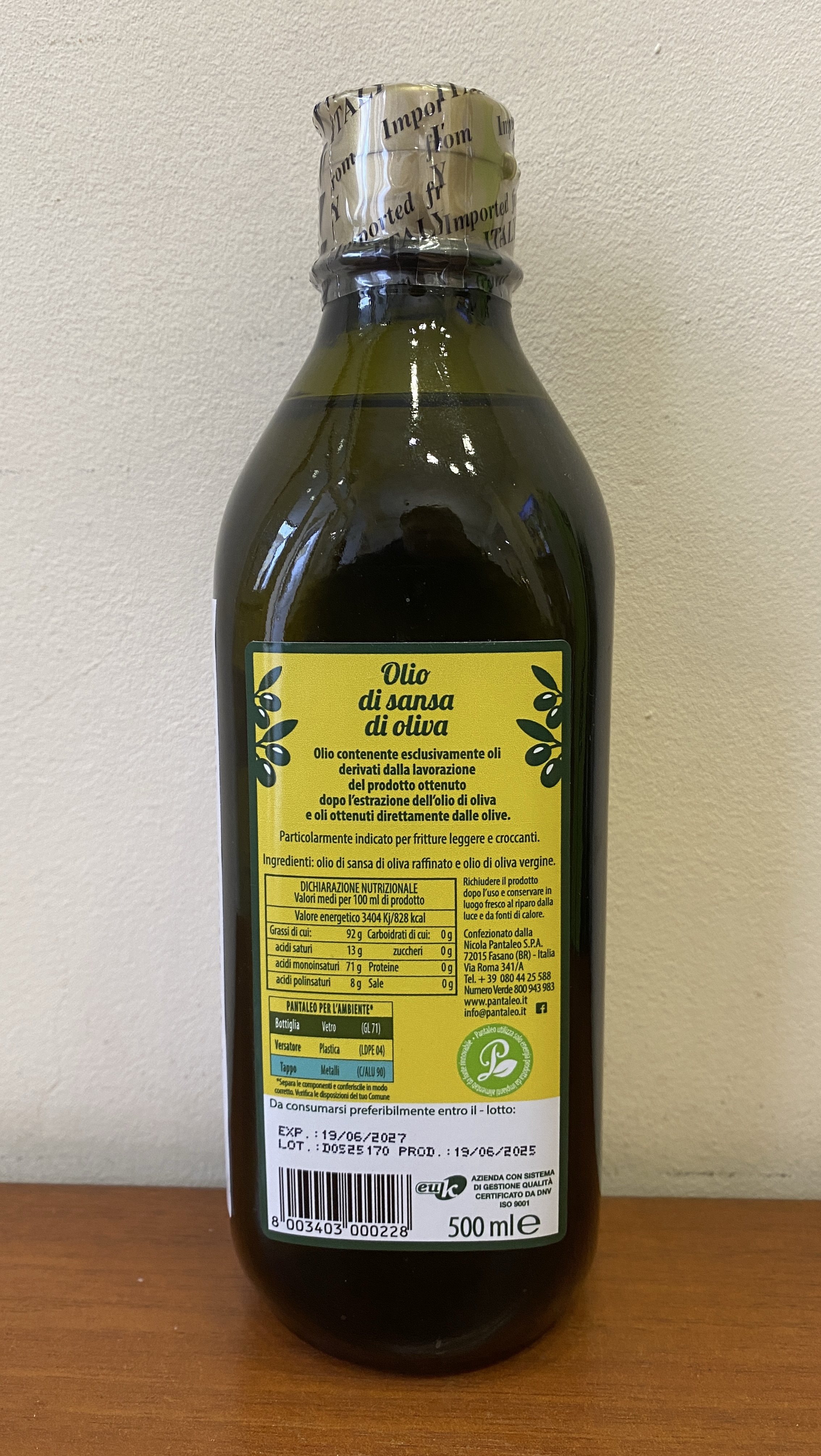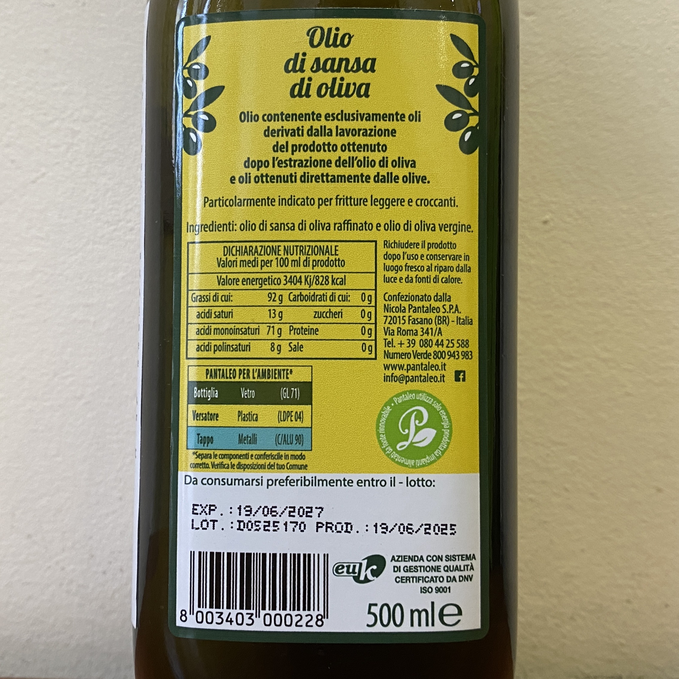 Оливковое масло PANTALEO pomace, стеклянная бутылка, 1л