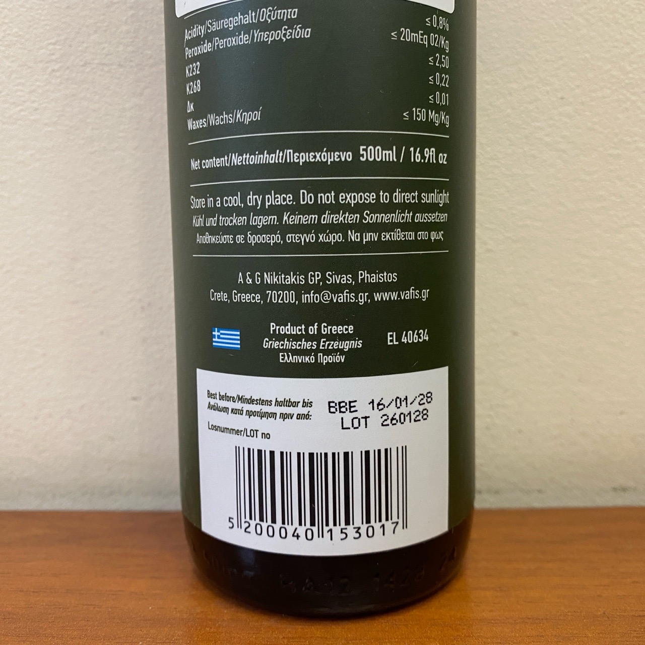 Оливковое масло Вафис имеет очень низкую кислотность и производится из оливок сорта Коронейки в большей части долины Мессара на Крите.