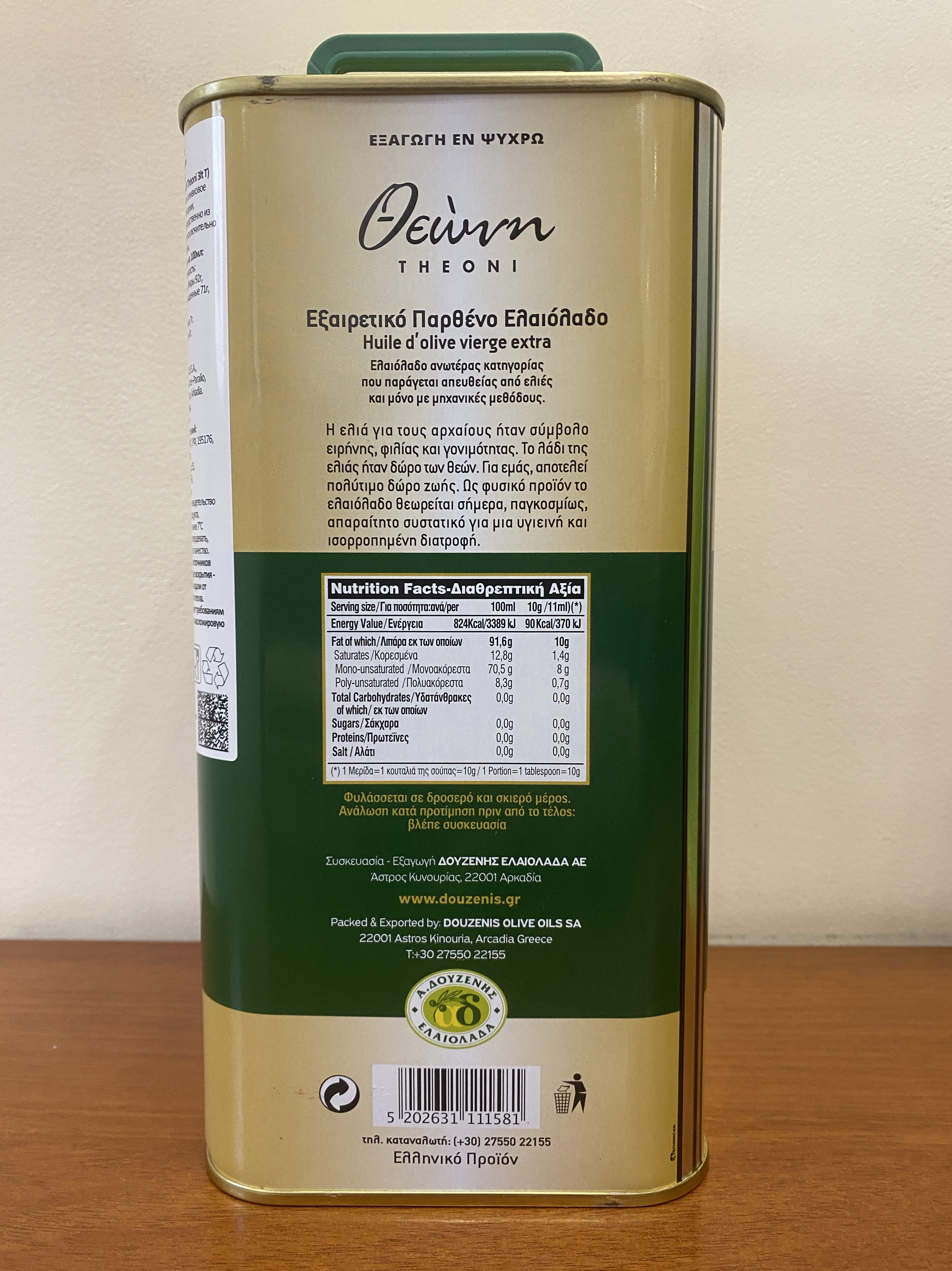 Oливковоe масла производится из ведущих греческих сортов Манаки, Мегарон и Коронейки, выращиваемых в районах Пелопоннеса .